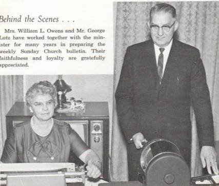 Behind the Scenes . . . Mrs. William L. Owens and Mr. George Lutz have worked together with the minister for many years in preparing the weekly Sunday Church bulletin. Their faithfulness and loyalty are gratefully appreciated.