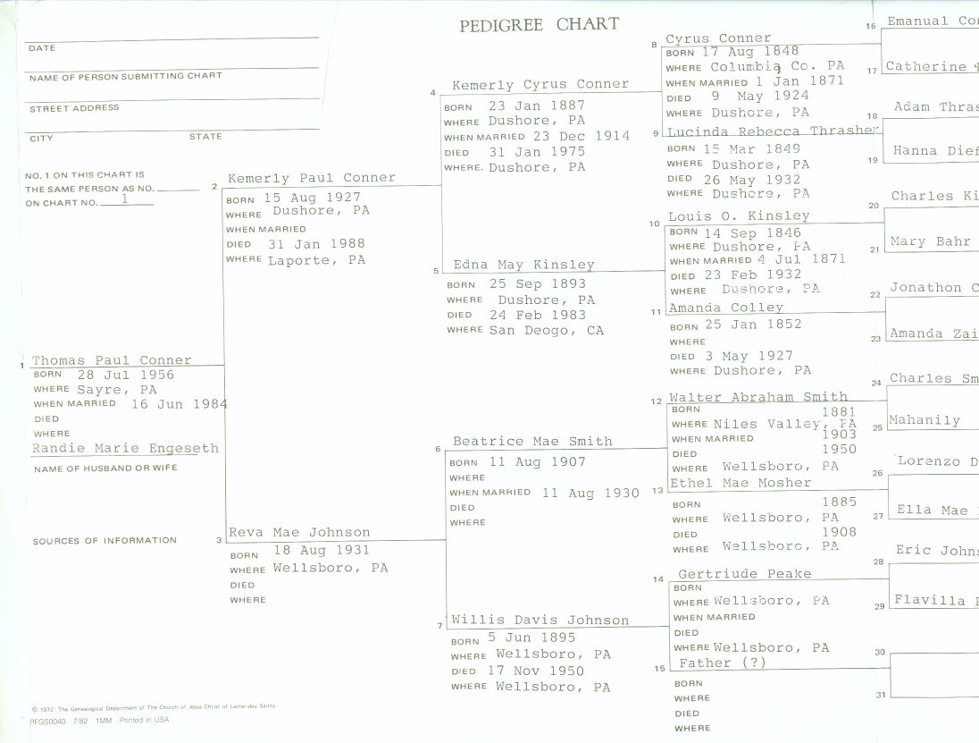 Let's begin with a historical overview. Presented below are the family group charts for the Kinsley and Conner families, respectively. You may want to use these charts for assistance in