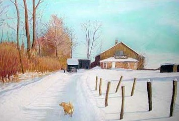 Pastel winterscape by Don Curry of his Sullivan County home captures life in rural Pennsylvania during the peak of winter. Curry's paintings were featured in an exhibit at Wyalusing's Blue Heron Art Gallery in January 2005. The exhibit was entitled "Images of Winter-Our Landscapes, Our Towns." The Blue Heron Art Gallery is located on Wyalusing's Main Street.