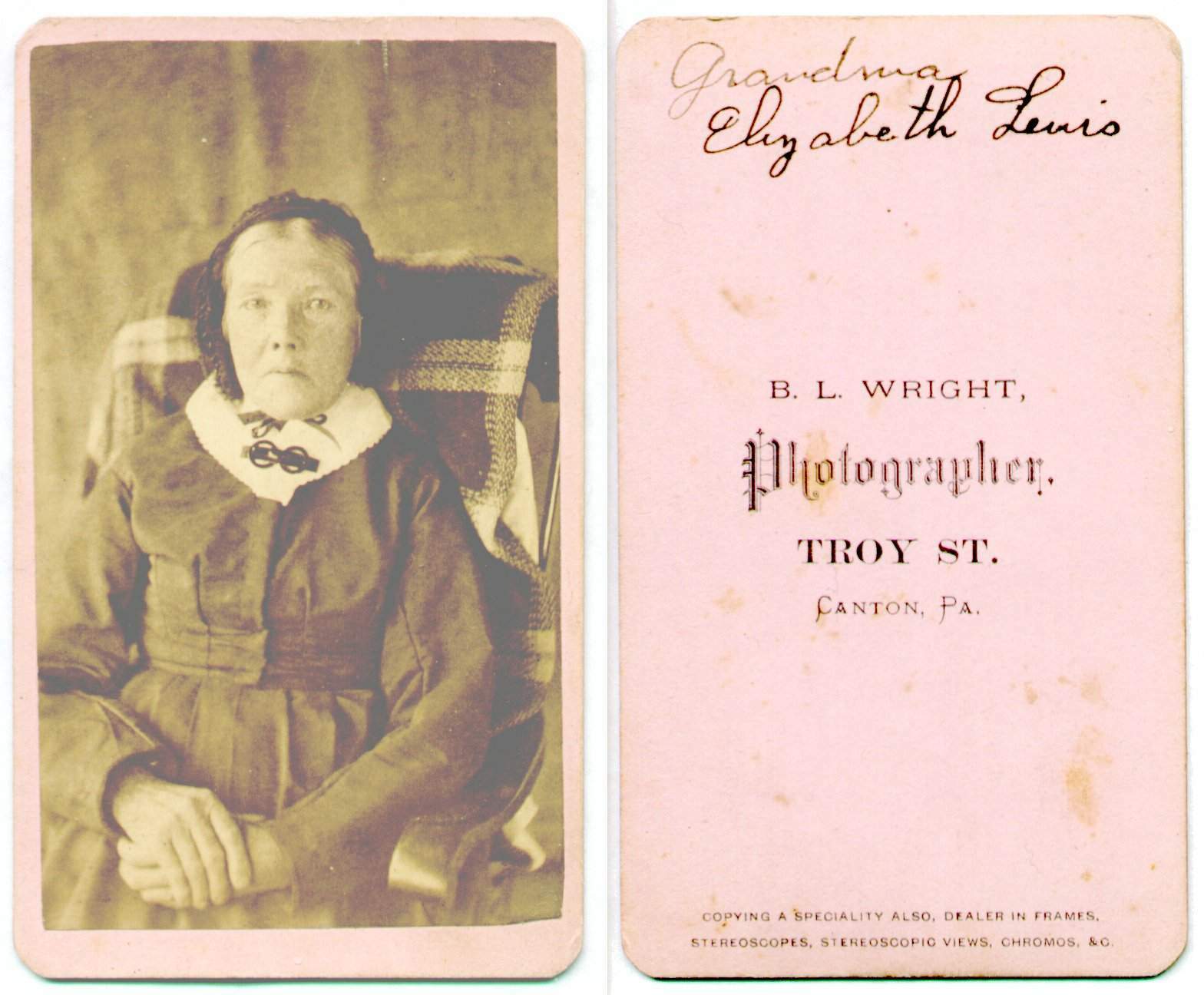shown in a picture taken soon after the turn of the century. A picture of Elizabeth, taken late in life by a Canton, PA photographer, is also shown below. This identification is based on