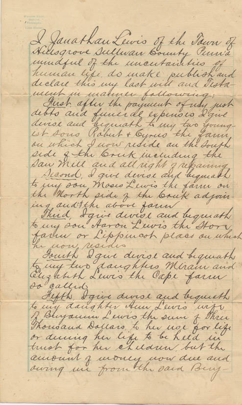 I Jonathan Lewis of the town of Hillsgrove Sullivan County Penna mindful of the uncertainties of human life do make publish and declare this my last will and Testament in manner following.