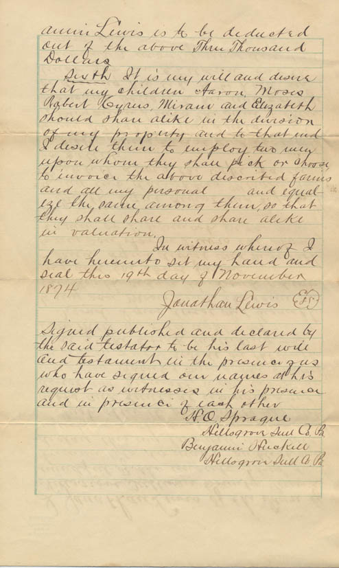 Last Will and Testament of Jonathan Lewis November 19, 1874 Contributed by Cindy Coppock Source: Brian Lewis Foust