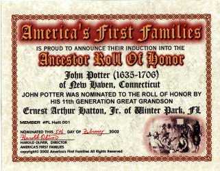 "First Families of America" has approved the descendancy from John Potter, a founder of New Haven, CT., to myself