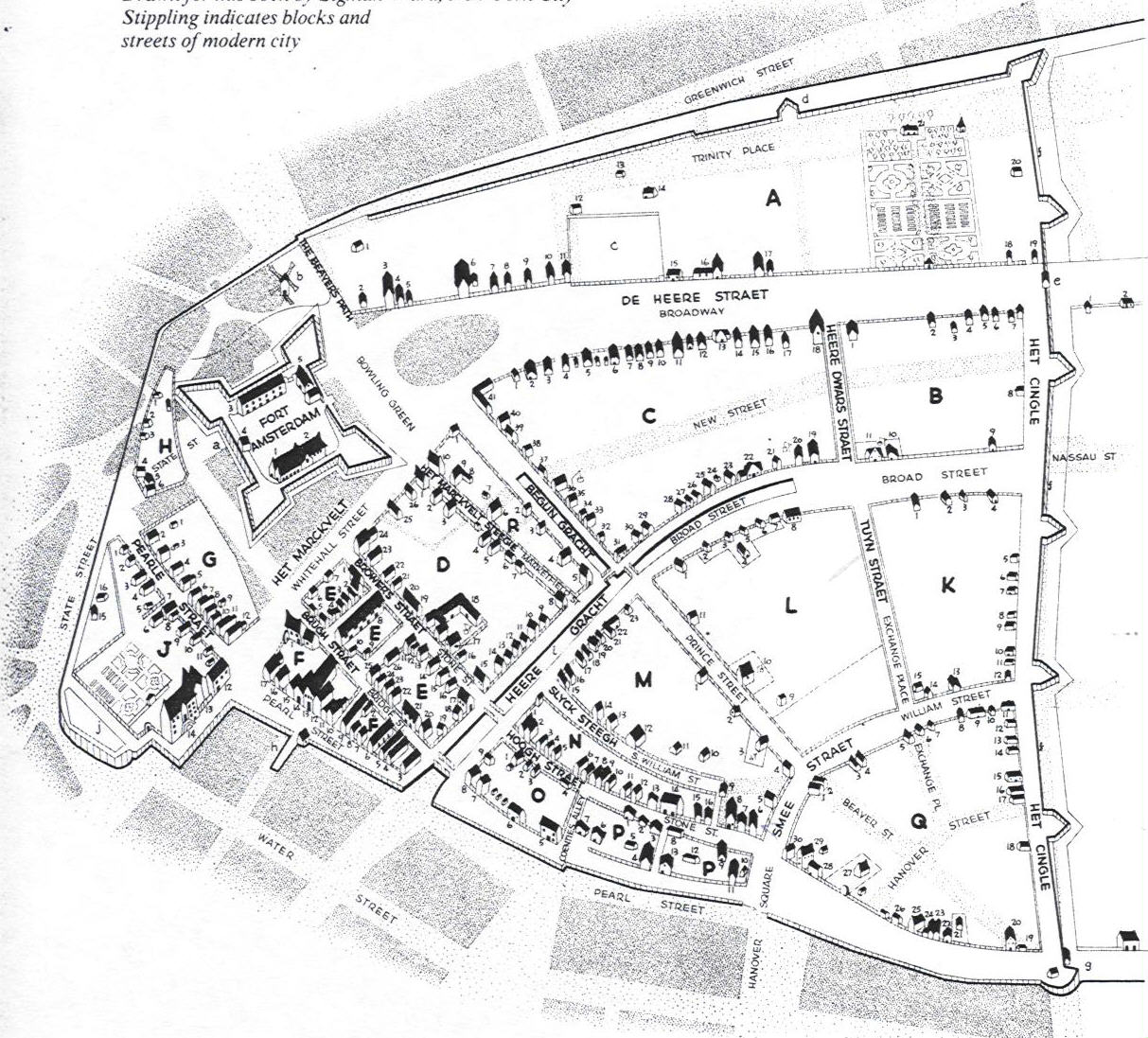 Additional emigrants arrived on Manhattan in 1625 and 1626. In the summer of 1626, Director General Peter Minuit purchased Manhattan Island from the Indians for trinkets worth approximately $24.00. Then, in September of that same year, a fort was established at the lower end of the island, and the eight families were brought from Fort Orange to settle at Fort (New) Amsterdam. For the next twenty-two years, Rapelje owned a house and lot adjoining the south side of the fort on the north side of present-day Pearl Street; the patent for the land was received March 18, 1647.