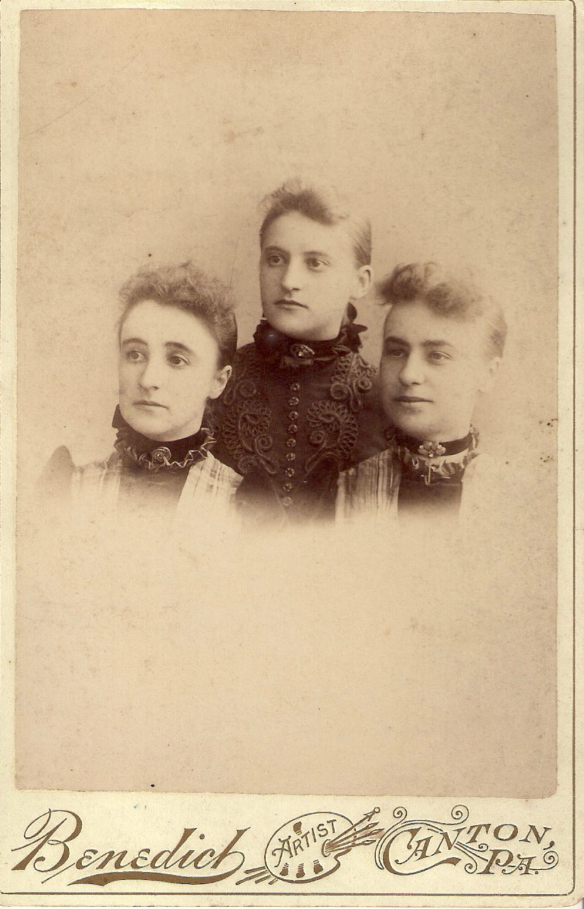 Louella Wright, wife of Isaac Hoagland, was one of three sisters born to John R. and Ann E. (Williams) Wright in Grover, PA. Ann died three months after giving birth to Louella in 1873, then John remarried to Ellen M. (Holcomb). Louella (May 25, 1873-December 25, 1960) is buried in Southampton, PA with her husband Isaac, as shown on her Death Certificate. Isaac and Louella, according to a family history written by several of their grandchildren, owned a large farm in Huntington Valley, PA, but moved to nearby Southampton after the Depression. He was a farmr, butcher and cabinet maker. She was a housewife with a passion for gardening. Here is a photo of the three Wright sisters, probably taken in the 1890s.: