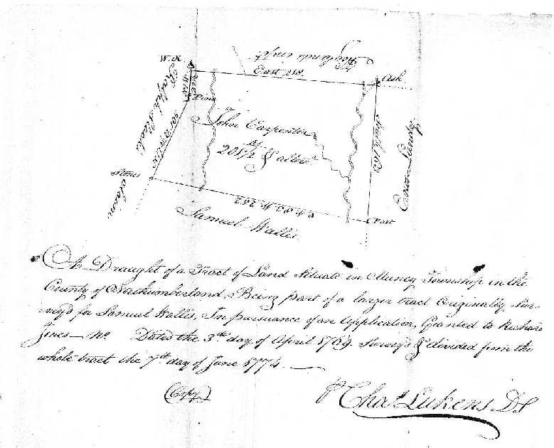 At the end of the war, Joseph with his family and the Carpenters returned to Muncy. If any squatter could prove settlement prior to 1780 on land located between Lycoming Creek and Pine Creek, he could submit a preemption application for purchase. The applications were limited to 300 acres, with the purchase price to be paid no later than May 1, 1785. Joseph never returned to his land on the west side of Lycoming Creek but agreed to sell the property to John Hays of Berks Co. On July 16, 1785, Joseph received from Hays 39 pounds, 18 shillings and four pence for the land; two days later the deed was recorded. On August 12, 1785, Hays submitted a preemption application which reads as follows:
