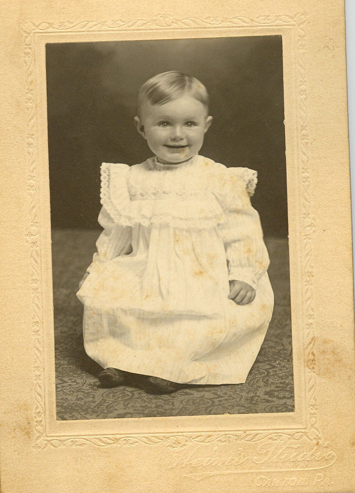 Hiram W. Brown (June 26, 1903-August 20, 1947) Son of Liston M. and Anna E. (Stull) Brown Taken About 1904 At Heims Studio, Canton, PA Note on photo refers to him as a "cousin". He was actually the grandson of William Brown and Angeline Warburton, who later married Reuben Wilber. Liston and Lewis Wilber were half brothers. Source: The Wilber Estate Collection Sullivan County Historical Society and Museum, Laporte, PA