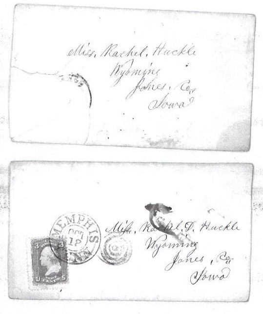 Historian's Note: Rachel Donnelly Huckell was born in Hillsgrove, PA on 9 September, 1827. Her parents were Benjamin Huckell and Margaret Plotts. In 1867, she became the second wife of John Braund, a prominent businessman in Towanda, PA. They had one child, Edward Joseph Braund. In 1879, they moved to Cawker City, Kansas. It appears that her family of origin had already located, at least temporarily, to Iowa at some point prior to 1863, however, since the letters shown below were addressed to Rachel at "Wyoming, Jones County, Iowa". Rachel died in 1900 in Cawker City, KS. Her son, Edward, moved to Colorado where he had 60 years continuous service as an official court reporter. He died in 1950. He had two children. I am the daughter of his eldest, Beatrice Braund, who died in 2001.