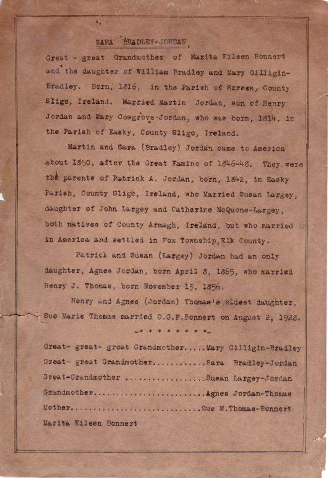 McDonald in turn was the daughter of Peter McDonald and Catherine Waters and was therefore a sister of Michael McDonald who married Annie Sweeney, daughter of Owen and Margaret Jordan Sweeney.