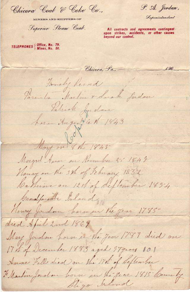 m. Catherine Jordan Philbin, on 25 May 1897; she was b. 21 Jun 1875, d. 20 Dec 1947, daughter of Michael Philbin and Mary McDonald; this Mary