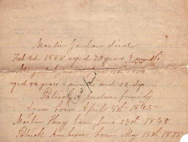 m. Catherine Jordan on 28 Apr 1862, b. 1829 in Ireland, likely daughter of Patrick and Margaret (Walsh) Jordan; see more about the Jordan family connection below