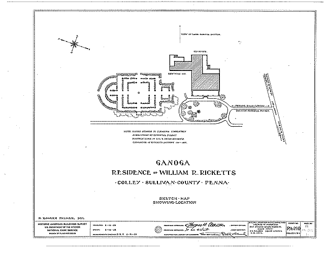 Note: The original file contains five measured drawings, three black and white photos, five data pages plus a cover page. It was composed by William Reynolds Ricketts (July 29, 1869-October 14, 1956). This document was transcribed for the Sullivan County Genealogical Web Project by Connie Hembree Gaban, October 7, 2001. There are many sources of information about the Ricketts family, the town of Ricketts and the Ricketts estate. You can learn more about the Ricketts family and the history of Ricketts Glen State Park at these two sources: