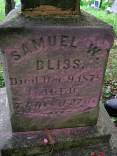 | BLISS | SAMUEL W(ard). | ( Nov. 12, 1805) | Dec 9,1878 | Age 73 yrs 27Dys | View Photo |