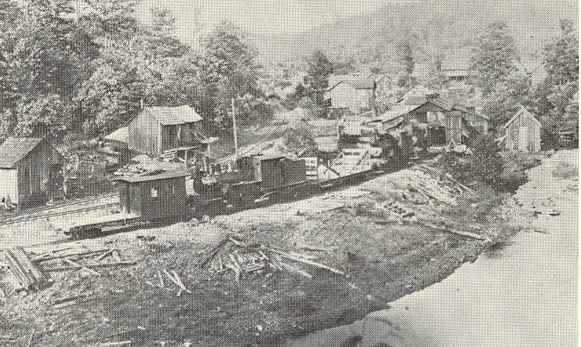 Downstream end of mill showing lumber piles and houses of employees. Coal Dock is here located on north side of main line track. Note piles of railroad ties in right center of photo. Trestle from mill was for hand pushed lumber trucks and not steam engines.