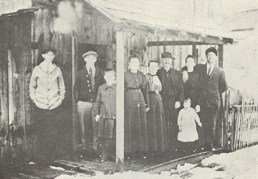 A triple house located near the school house. Mr. and Mrs. Jack Layton (shown standing on either side of baby carriage) were the lucky ones who lived in the center unit and thus had heat from both sides. Mrs. Layton said that even that was not much help on a cold winter’s morning. It was not unusual to find the buckwheat cake batter frozen in its bowl on the kitchen table. Note the “cold cellar” in the foreground and the manicured front lawn.