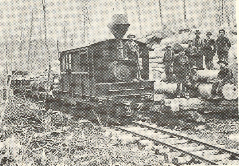 Sones system of railroading was rather crude. He would construct a main line and then run spurs out into the woods where the logs were being cut. The grades were steep as only empty cars need be taken up hill. Ballast was seldom used between ties on these spurs. Gullies were crossed by log cribbings and as little excavation as possible was done. These spurs had a very short life span - sometimes only a month or so. The Italians would construct a spur into one area and then move to another area and construct for future cutting. When an area had been cut, the track was torn up; and moved to another site. The rails, used, weighed only 30 lbs. to the yard and were ot intended for continuous heavy traffic.
