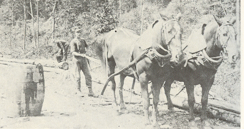 POLE ROAD HOLLOW: A tram car railroad from Camp 5 to the Continental Divide. The rails were made of poles and the wheels of the tram car were concave and were loose on the axle to follow the variance in width of the rails. The loaded cars were snubbed by ropes or cables downhill and the empties were pulled back up the hill with horses.