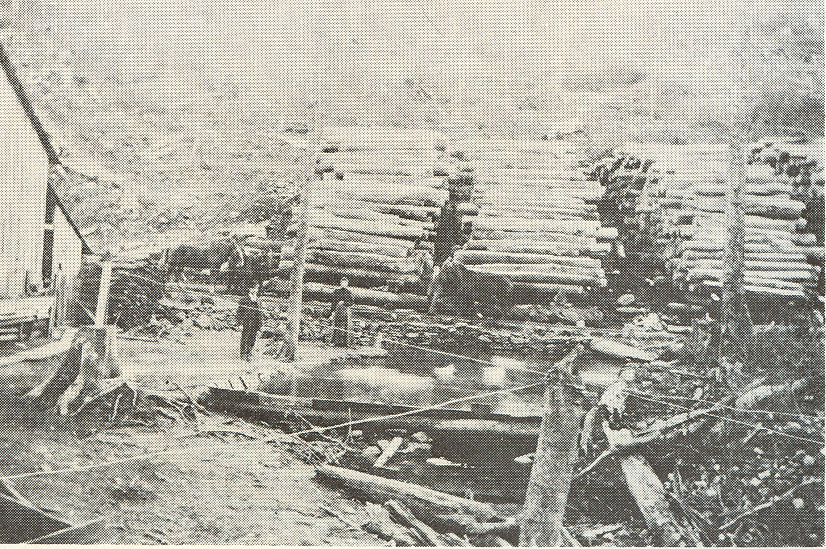 Logs being washed in mill pond prior to being drawn up jack slip to the band saw inside mill. Note large piles of railroad ties above mill left.