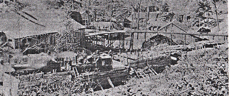 Looking up stream from the mill. In the foreground are the ice house, (with ladders), engine and car repair shop, coal dock and sand house and oil shed. In center back ground can be seen the end and roof of the Cheney house.