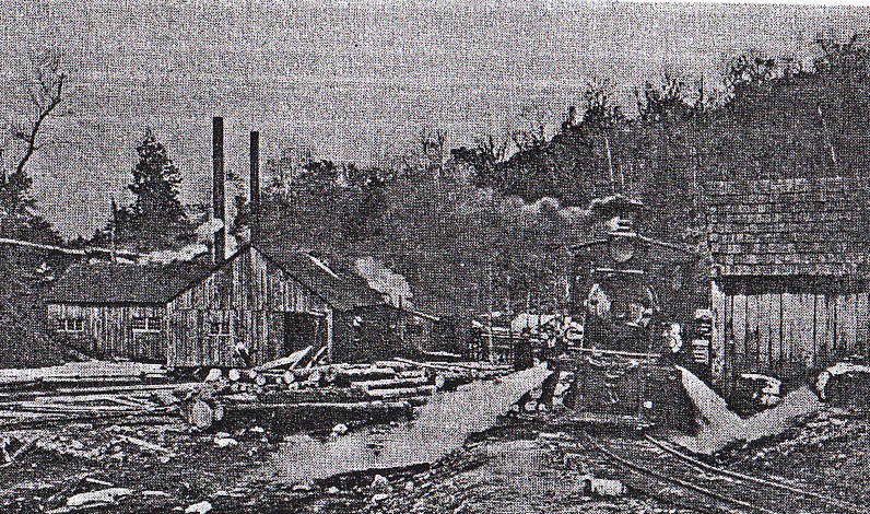The mountain side directly across from the mill was too steep for railway operation so here Sones constructed a log slide. This was a “V” shaped trough formed by three logs. Logs were skidded to this and rolled in and gravity did the rest until they ended in a rough-and –tumble pile on the bank across from the mill. In summertime the logs were greased or “tarred” to keep the friction from setting them on fire. In winter, the slide was sprinkled with water so that ice would form a slick surface. To keep the logs from running too fast on the steeper places an arch was built over the slide and sharp steel spikes were set to slow the speed.