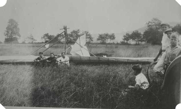 Leo McGuire is the grandson of Charles McGuire of Forksville. The McGuire family lived in the Forksville area for several decades and can be found represented in the Fairmount Cemetery there. Here are some recollections about Forksville in Leo's words. We also include several pictures of his father Francis and other McGuires who seem to have been a rather adventurous crew--from lumberjacks to amateur glider pilots!! In the glider-flying incident pictured below, Francis was the pilot of a plane built by William Simmonds and friends; his brother James McGuire drove the tow car. Later, it was learned that Francis broke his back in the landing. There are additional pictures of the "glider crew" and plane at the bottom of this page.
