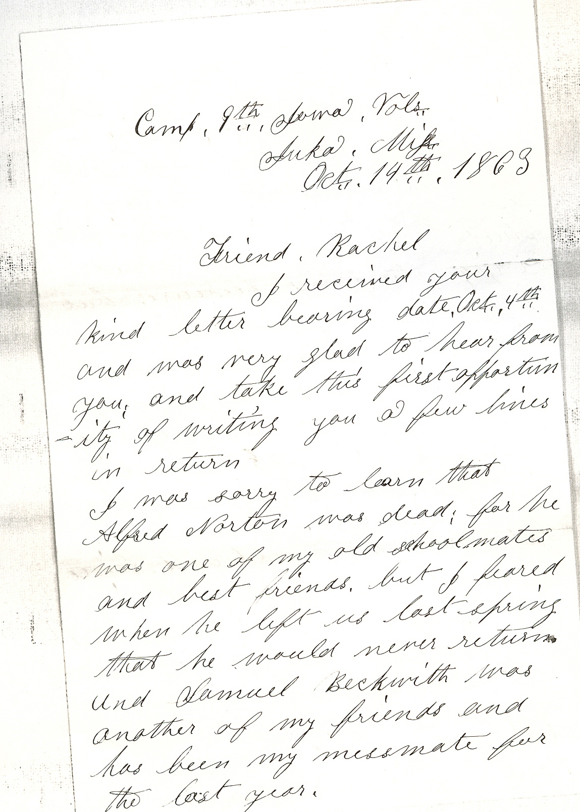 The camps in which John Green was stationed when he wrote these letters were Young's Point, Louisiana and Iuka, Mississippi, respectively. He was a member of Company A, 9th Regiment, Iowa Volunteers. The "Wyoming men", to whom Green refers, is a comment about the soldiers from the town of Wyoming, Jones County, Iowa, where Rachel was living at this time.