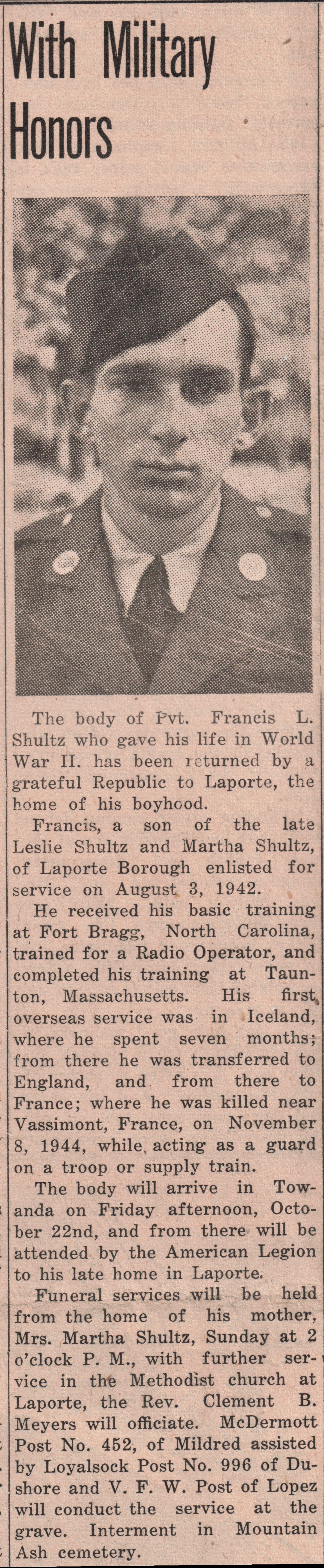 | Shultz | Francis | L | 13091391 | Army | PVT | DNB | X | Obit/Photo | Laporte | 8/3/1942 | Field Artillery | 5/5/1924 | 11/8/1944 (Age 20) |