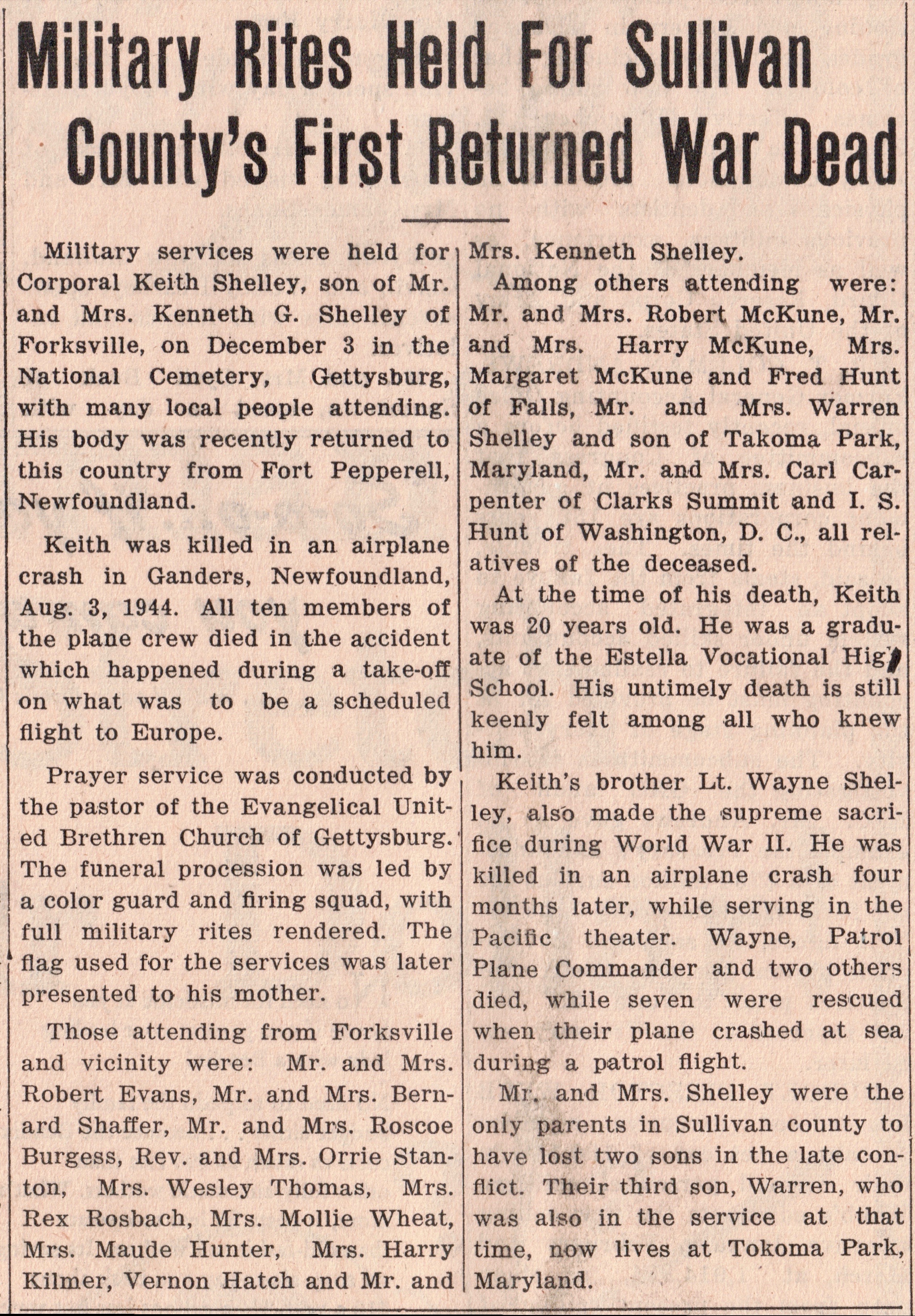 | Shelley | Keith | M | 13092419 | Army | CPL | DNB | X | Obit | Forksville | 9/16/1942 | Air Corps | 10/5/1923 | 8/3/1944 (Age 20) |