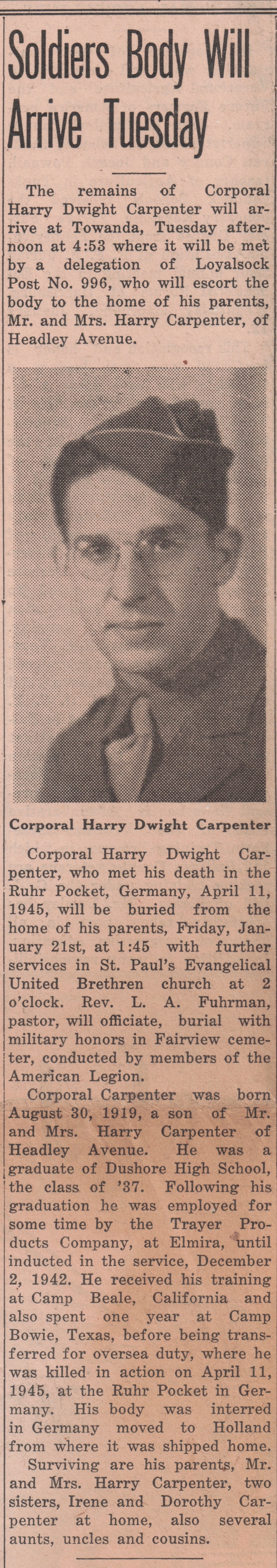 | Carpenter | Harry | D | 33359693 | Army | CPL | KIA | Obit/Photo | Dushore | 11/25/1942 | 8/30/1919 | 4/11/1945 (Age 25) |