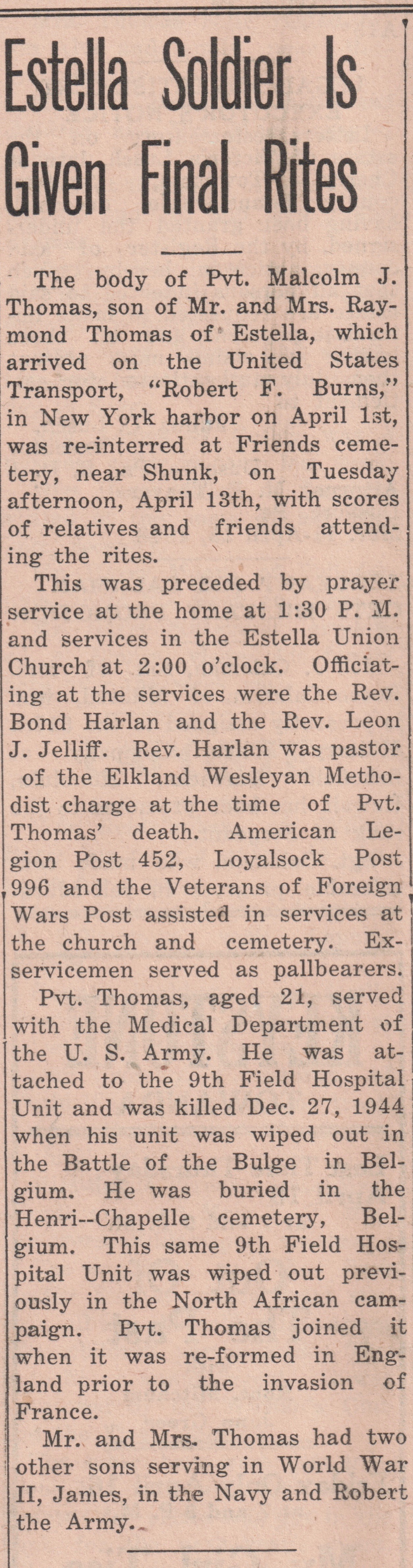 | Thomas | Malcolm | L | 33462100 | Army | PVT | DOI | X | Obit | Estella | 1/30/1943 | Medical Dept | 2/17/1923 | 12/27/1944 (Age 21) |