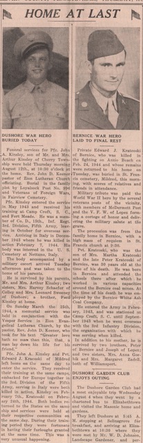 | Kinsley | John | A | 33604478 | Army | PFC | KIA | Obit/Photo | Cherry Township | 4/28/1943 | 1920 | 2/7/1944 (Age 23-24) |