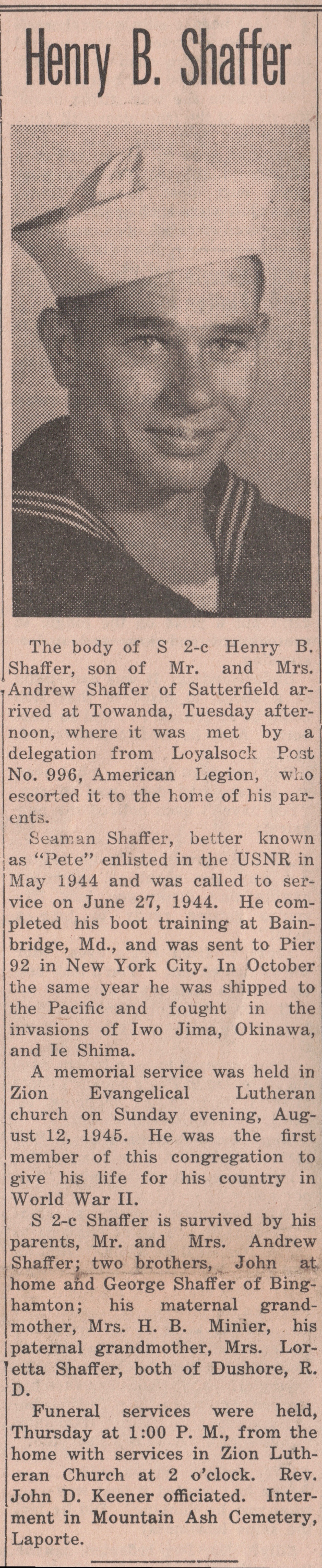 | Shaffer | Henry B. | B | Navy | S 2-c | Obit/Photo | Satterfield | May-44 | 5/18/1926 | 1945 (Age 18-19) |