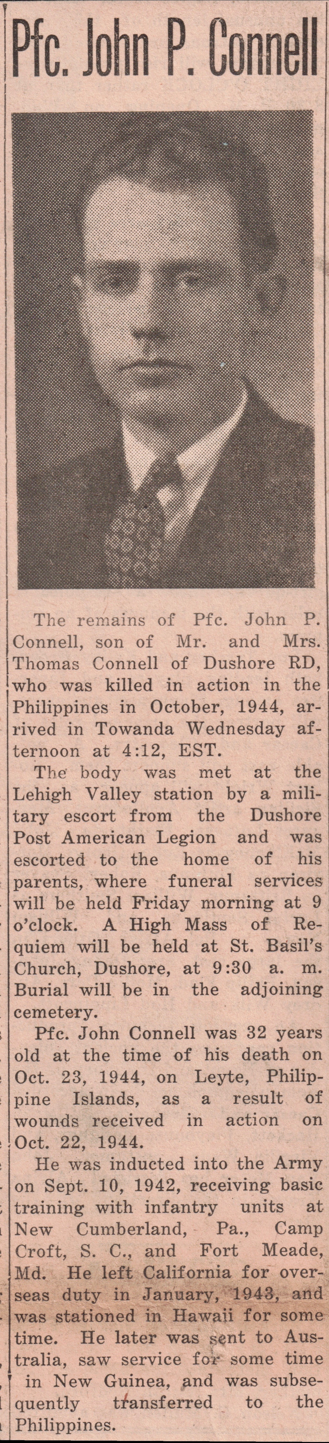 | Connell | John | P | 33352459 | Army | PFC | DOW | X | Obit/Photo | Dushore | 8/27/1942 | 5/22/1912 | 10/23/1945