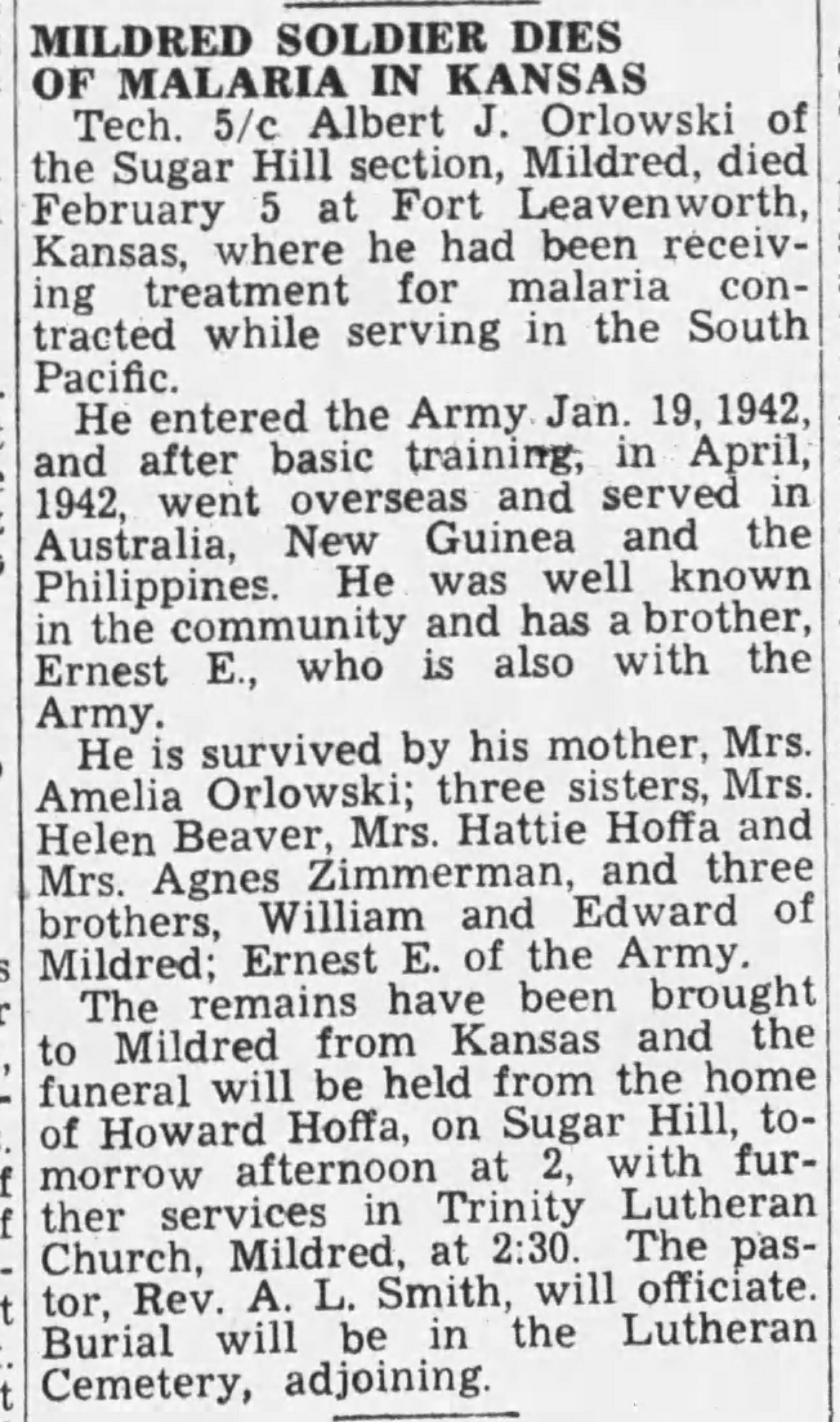 | Orlowski | Albert | J | 33135152 | Army | TEC 5 | DNB | X | Obit | Mildred | 1/20/1942 | 1918 | 1945 (Age 26-27) |
