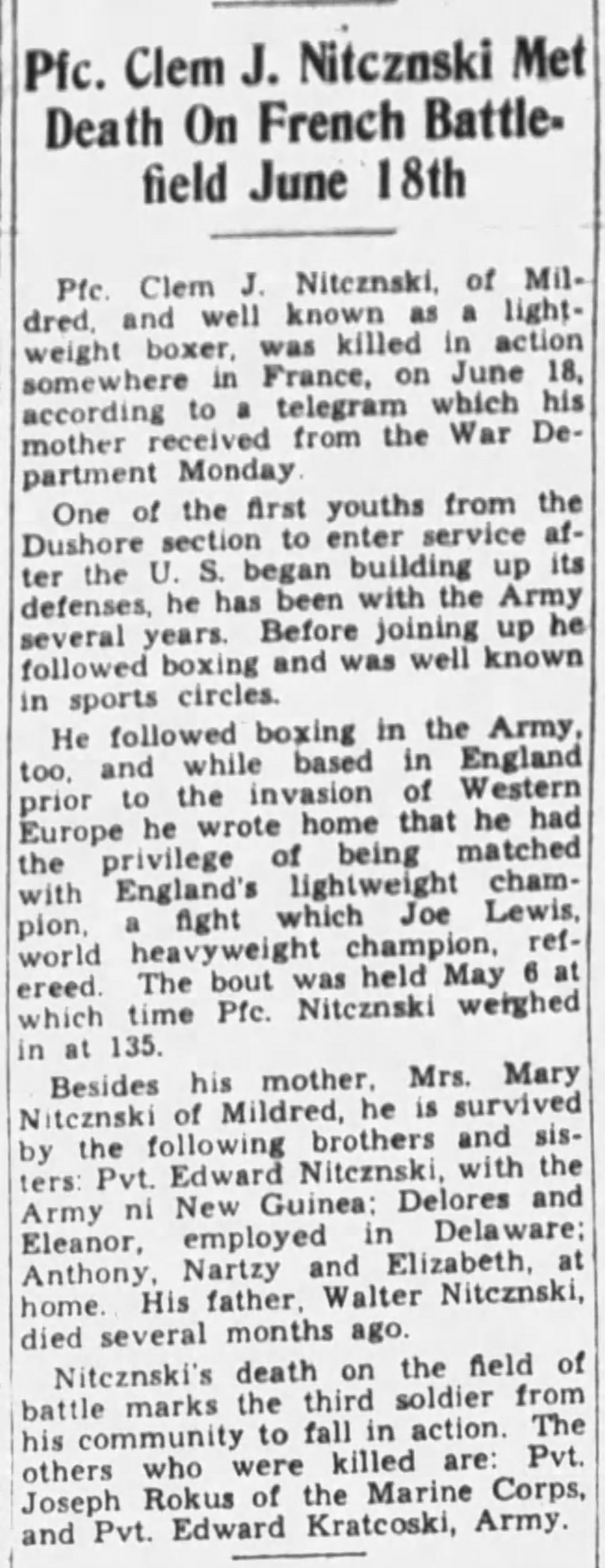 | Nitcznski | Clemences (Clement) | J | 33135151 | Army | PFC | KIA | X | X | X | Obit | Dushore | 1/20/1942 | 12/11/1918 | 6/18/1944 (Age 25) | Normandy