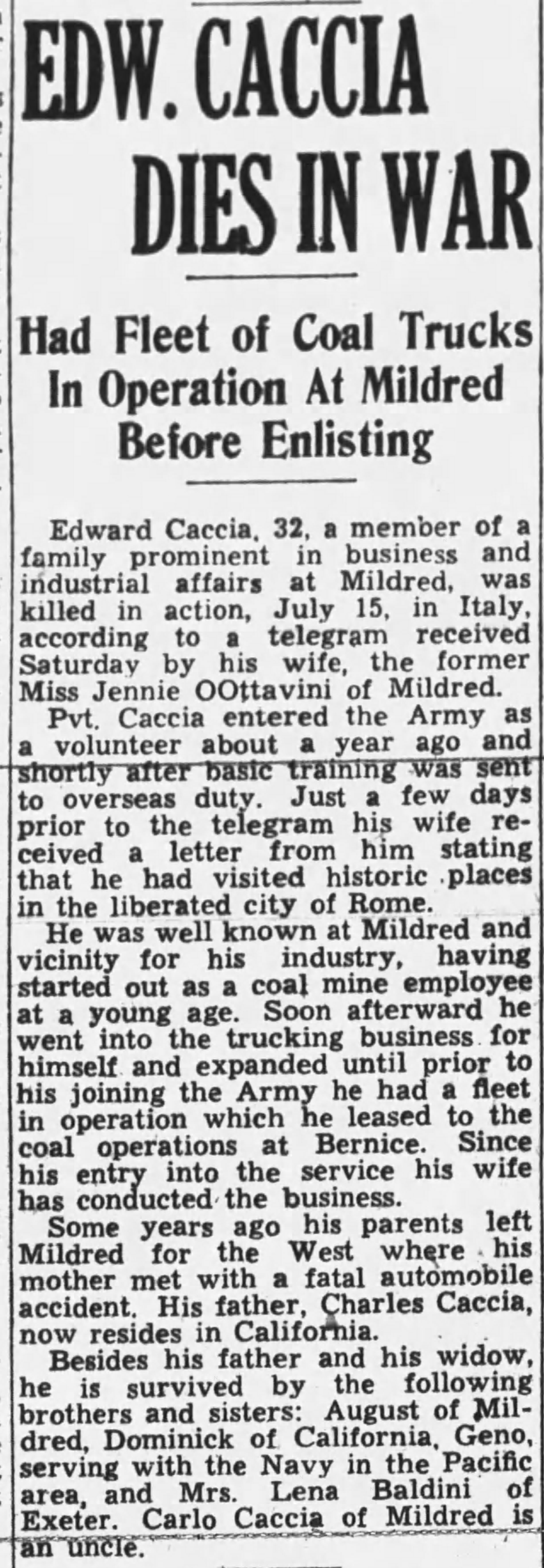 | Caccia | Edward | 33606135 | Army | PVT | KIA | X | X | X | Obit | Mildred | 5/28/1943 | 12/21/1911 | 7/15/1944 | Florence American Cemetery, Plot F Row 8 Grave 31, Florence Italy | 362nd Infantry Reg, 91st Infantry Div | Purple Heart | ||
