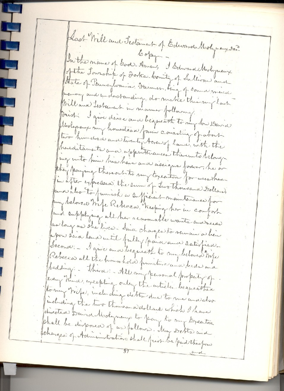 to ocean, occupying more states than the Union then contained. I think it is reasonably certain that of the permanent settlers, William Molyneux was the first to come and spy out the land, and the first to make improvements, which was in 1794, just one hundred years ago. That in all probability Powell Bird was the second to come and view the land, which was also in 1794, and that John Warren, who came with his family in 1795, was the third to come, and the first to bring his family, and that William Molyneux and Powell Bird brought their families in the fall of the same year. Editor's Note: The Molyneux, Warren and Bird families were tied closely by geography and marriage, but that does not mean they always got along, as related in The Molyneux Feuds. At least three men had previously lived for short periods in this vicinity, but they never became in any sense of the word, settlers. One of them, a man named Strong, came from Cherry Valley, in "York state," and built a cabin on the bench of land where Millview now stands, close by the mountain brook which starts from a spring on Geo. C. Bird's land, and is still known as Strong's run. He had been led to believe that it was only twelve miles down the Loyalsock to its junction with the West Branch of the Susquehanna, but when he made the trip to the river, and ascertained that instead of twelve miles the distance was at least forty very difficult miles, he returned to Cherry Valley. Another by the name of Brown came and built a cabin on the land now owned by Isaac Rogers, near the foot of the mountain gap, which bears his name, but soon afterwards abandoned his cabin and moved away. Still another by the name of Ogden lived for a while near Hillsgrove. When Molyneux, Bird and Warren settled at what is now Millview, ten miles away. Ogden said the country was getting too thickly settled to suit him, and moved to the neighborhood of what is now Clearfield county. He was a peculiar man, and it is said disliked English settlers for the reason that a son of his had been killed by the English in the Revolutionary war. A small creek entering the Loyalsock just below Hillsgrove is still called the Ogdonia, presumably in honor of the old trapper. Many stories are told of the hardships and privations endured by these first settlers. There had probably been but one road made into this part of the country at that time--Wallis' road--which was not much more than a blazed path from Muncy, then Pennsyborough north, through Wallis' Gap to the top of the mountain, then in a northeasterly direction to the neighborhood of Double Run, then northwardly past the "world's end" to the forks of the Loyalsock, where Forksville now stands, which was used by surveyors while surveying the large tracts of land then owned by Robert Morris, Joseph Priestly, Jr. and others in the vicinity. Another road or path was known as the "Harris' path," but where it was located I am not informed. Harris was also a surveyor, who was in this vicinity with Wallace at various times from 1777 down to about the time the first settlement was made. I understand that in coming here these setters came over the mountain from Muncy, past Abram Webster's, and struck the Loyalsock at or below Hillsgrove. It is told that they forded the Loyalsock thirteen times from Hillsgrove up. That everything had to be packed on horseback or on their own backs, as horses were scarce they frequently had to go on foot to Muncy, their nearest trading place (only thirty miles) and bring back what few store goods they were compelled to use. The mortar and pestle was the only mill they had for years. Game was plenty. Trout, deer, wild turkeys and bear meat could almost be had for the asking. I have heard my grandmother Molyneux, formerly Rebecca Bird, say that they could go out before breakfast and catch all the trout they could eat, and that some of them were eighteen inches in length. It is told that when on one of the first trips up, probably that of Molyneux and Bird in the fall of 1794, when near Ogden's cabin, they heard the barking of a dog, and one of them (Bird I suppose, as Molyneux had been up before) supposed they were coming into a camp of Indians, and was for retracing his steps at once. He was, however, induced to proceed, and was overjoyed to learn that instead of blood-thirsty Indians they had found a friendly white man and his dog. Another story is told, that when the Bird family came up they camped for the night on a large flat rock on the northwest side of the Loyalsock, between Forksville and what is known as the "wolf trap," and that George Bird, at that time about five years old, said that would be a good place to build the house, and they need not go any further. The place is known as George's Rock to this day. There were dangerous wild beasts here then, but I believe there was but one casualty on their account, and that fortunately did not result in the loss of life, except to the beast. In the year 1811 Job Summers, a lad about eleven years of age, living with Powell Bird, his grandfather, was sent across the creek and up on the side hill to bring the cows. When coming back with the cows he heard the cry of a panther, but as the sound was much like a human voice he concluded that it was his uncle George Bird, who was then a young man of twenty-one, and called back, "Oh, you can't scare me, uncle George," and went on with the cows. When they came to the creek, just opposite the Bird residence, the cows started to ford the creek, and little Job walked on down towards where the canoe or dugout was tied in which he had "poled" himself over. As soon as he had left the cows the panther sprang upon him. Job called murder as loud as he could and fell on his face. The panther turned him over with his paw and endeavored to get at his throat, but he had on a home-made tow shirt, with buttons sewed on with linen thread, which would not give way. The cry of murder was heard at the house, and this same uncl