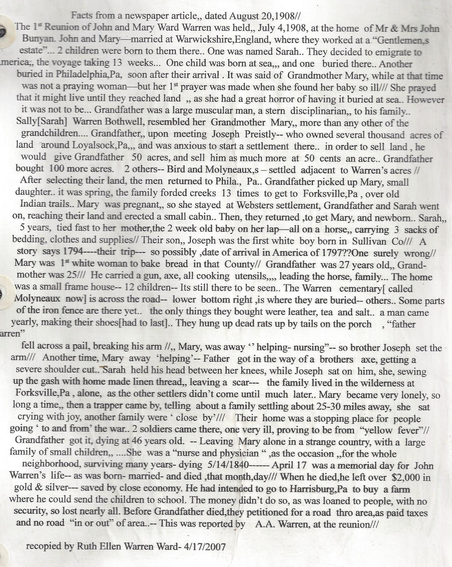 Note from Marolyn Cole: I have no other parts of this booklet. A copy of this booklet was sent to me by my cousin, Charles Nicholson in 1980. I am impressed by a similar story of impressment attributed to James Harding and wonder if that story ever got mixed up, glamorized and enhanced and thereby claimed by more than one family. Copyright © 2001 Robert E. Sweeney and individual Contributors. All Rights Reserved. Prior written permission is required from Robert E. Sweeney and individual Contributors before this material can be printed or otherwise copied, displayed or distributed in any form. This is a FREE genealogy site sponsored through PAGenWeb and can be reached directly at ~Sullivan County Genealogy Project (http://www.rootsweb.com/~pasulliv) Back to the Sullivan County Genealogy Page |