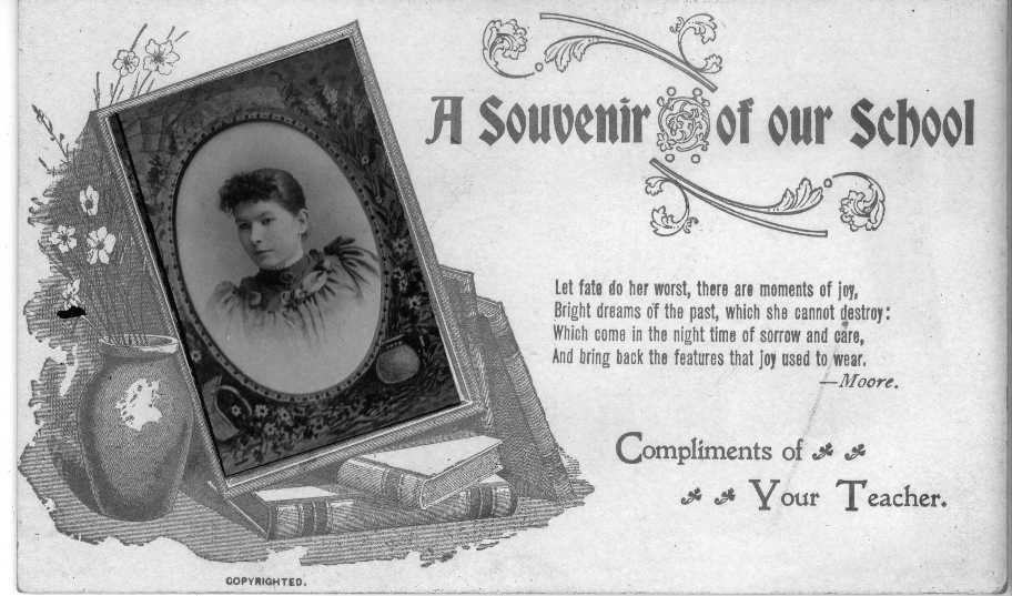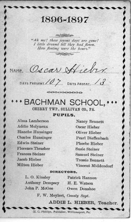 Here are pictures of a year-end school card issued by the Bachman School in Cherry Township for the 1996-1997 school year. Aside from its historical interest as an artifact, the card brings together in the same classroom two branches of the Hieber family. You will note that four of the students in attendance (Jacob, Milton, Oscar and Oliver) were children of Emanuel G. Hieber; while Phoebe Hieber, another student, and Addie L. Hieber, her sister and the classroom teacher, were children of Benjamin Hieber, the brother of Emanuel. Addie's picture is shown on the cover of the card. Notice the other surnames in attendance, reflecting the presence of other great old families in the Sullivan County historical panorama.