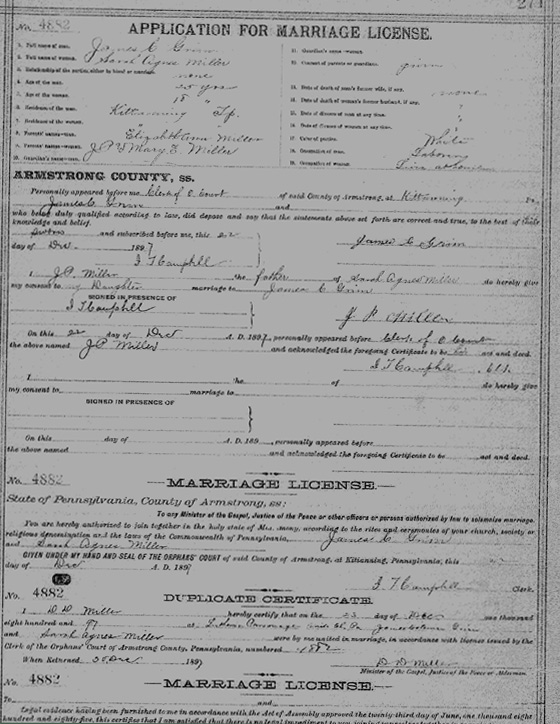 | Adams, Mary Jane | Jefferson Co. | Armstrong Co. | 18 | 1 | 27 Dec 1888 | Henry Grant Brick | Laborer | Reynoldsville | 20 | 1 | Jefferson | |||