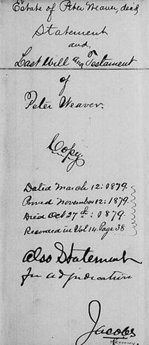 Last Will and Testament of Peter Weaver of Amity Twp., Berks County, d. October 27, 1879 (Image 690-852 110 documents in all some have multiple pages. The will written March 12, 1879 is not in the beginning, but a copy was found somewhere in the middle of the documents. Proved November 12, 1879) In the name of God Amen, I, Peter Weaver of Amity township, Berks County and state of Pennsylvania, widower, being of good health of body and of sound mind, memory and understanding but considering the uncertainty of this transitory life, do make and publish this my last will and testament in manor and form as follows. 1st. I nominate constitute and appoint my esteemed friend Jeremiah VanReed the Executor of this my last will and testament and of my estate reposing in him full confidence in his integrity to perform the trust thus hereinafter unto him committed and hereby revoking all other wills legacies and bequests by me heretofore made and declaring this and no other to be my last will and testament. 2nd. I order and direct my said Executor to have a fair valuation and appraisement made according to law at the time of my deceased of all my estate real, personal by three disinterested men and have the same regularly filed in the Registers Office at Reading. 3rd. I order and direct my said Executor to dispose of all my personal property effects and not otherwise bequeathed as soon after my decease as conveniently can be done, collect and settle up my estate and there out pay my just debts and funeral expenses. 4th. I give and bequeath unto Mahlon E. Weidner and wife ten (10) shares of one hundred dollars ($100) each of my preferred stock in the Northern Pacific Rail Road Company, and unto their heirs and assigns. 5th. I give and bequeath unto Levi Miller and wife ten (10) shares of one hundred dollars ($100) each of my preferred stock of the Northern Pacific Rail Road Company and unto their heirs and assigns. 6th. I give and bequeath unto Clara Yocum (daughter of Moses Yocum) ten (10) shares of one hundred dollars ($100) each of my preferred stock of the Northern Pacific Rail Road Company and unto her heirs and assigns. 7th. I give and bequeath unto Weaver Shearer (a son of Henry Shearer) twenty (20) shares of one hundred ($100) dollars each of my Preferred stock of the Northern Pacific Rail Road Company, provided the said Weaver Shearer at the time of my decease should yet be in his minority then said stock so to him bequeathed shall be transferred unto Levi Miller aforesaid in trust for said legatee until of age by my said Executor whom I hereby fully empower and authorize so to do, also the same with three bequests of stock if necessary so to do, according to the mode and usages of said Company. 8th. I give and bequeath or donate unto the Trustees of the Amityville Cemetery, and unto their successors for the use of said Cemetery the sun of five hundred dollars to be applied to the repairs, enlargement of said Cemetery in lieu which said Trustees or successors shall forever keep my burial lot fence in the said Cemetery clean and in repair and in default of said Trustee accepting said bequest on said condition then the said bequest to be void and of no effect. 9th. I order and direct my said Executor to pay unto Ann Mathias out of my estate such sum or sums of money as may be due and owing her with interest by my son Jeremiah after final settlement and distribution of his present assignees in case the same is not done so in some shape or other in my lifetime. 10th. I give and bequeath unto the aforesaid Weaver Shearer my gold watch and chain to be taken care of by Mrs. Levi Miller until she thinks fit for him to have it. 11th. I given and bequeath unto the said Levi Miller my iron safe, horse carriage, harness and desk. 12th. I give and bequeath unto my son Jeremiah Weaver, my bed and bedstead, all the bedding thereto belonging. 13th. I give and devise unto the said Weaver Shearer, All that certain messuage tenement plantation and tract of land whereon I now reside, situate in Amity Township, Berks County and State of Pennsylvania, bounded by lands of J. VanReed, Peter K. Ludwig, Levi Miller, Abraham Boyer, Ezekiel Rhoads and others containing one hundred and eighty (180) acres more or less, or so much thereof as I may hold at the time of my decease and not otherwise devised. Together with four tracts of woodland situate in Earl Township County and state aforesaid, three of which are adjoining ones bounded by lands of Levi Miller, David Bucher, John Wise, Jacob Geiger and others, containing together thirty five acres more or less and the other is called the Sands tract bounded by lands of Daniel L. Rhoads late Solomon Rhoads and others containing four acres more or less. All of which he shall have in possession on the first day of April ensuing the decease of my son Jeremiah, reserving in the meantime all the rents, issues and profits thereof, that is to say to lease and release the said farm and cut off the wood from time to time for repairs fire wood posts rails and of the wood land also for posts, rails, firewood and also to sell when fit to be lent, provided however should said devise die without issue or descendants of such, then and in such case, said real estate and rail road stocks hereinbefore unto him bequeathed shall fall back and vest to my estate and then to be distributed as hereinafter divided. 14th. I hereby order and direct my said Executor to lease or let the hereinbefore devised farm or plantation to some good and trustworthy tenant or tenants to the best advantage and interest to the farm during the lifetime of my son Jeremiah and pay over unto him at times such of the net rents, issues and profits thereof as he may want or my executor may deem expedient to pay over unto him keeping in had at all times sufficient sums or amounts of such rents to meet ordinary and even extraordinary expenses and repairs none of such rents, etc. however shall in any wise be liable to be attach