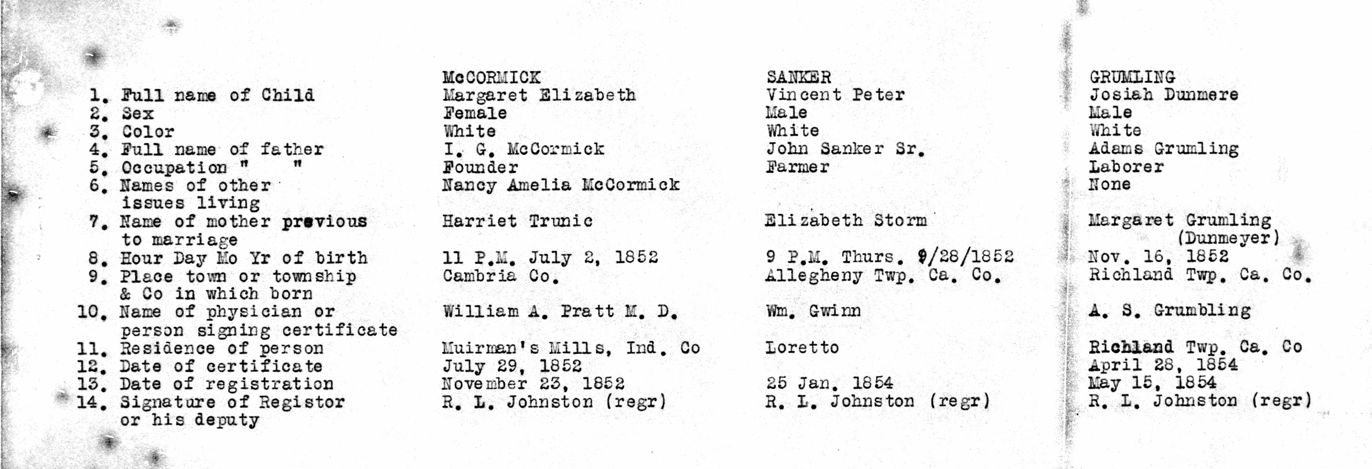 - Cambria Pennsylvania Births 1852-1854 03, McCORMICK, TRUNIC, SANKER, STORM, GRUMLING, DUNMEYER