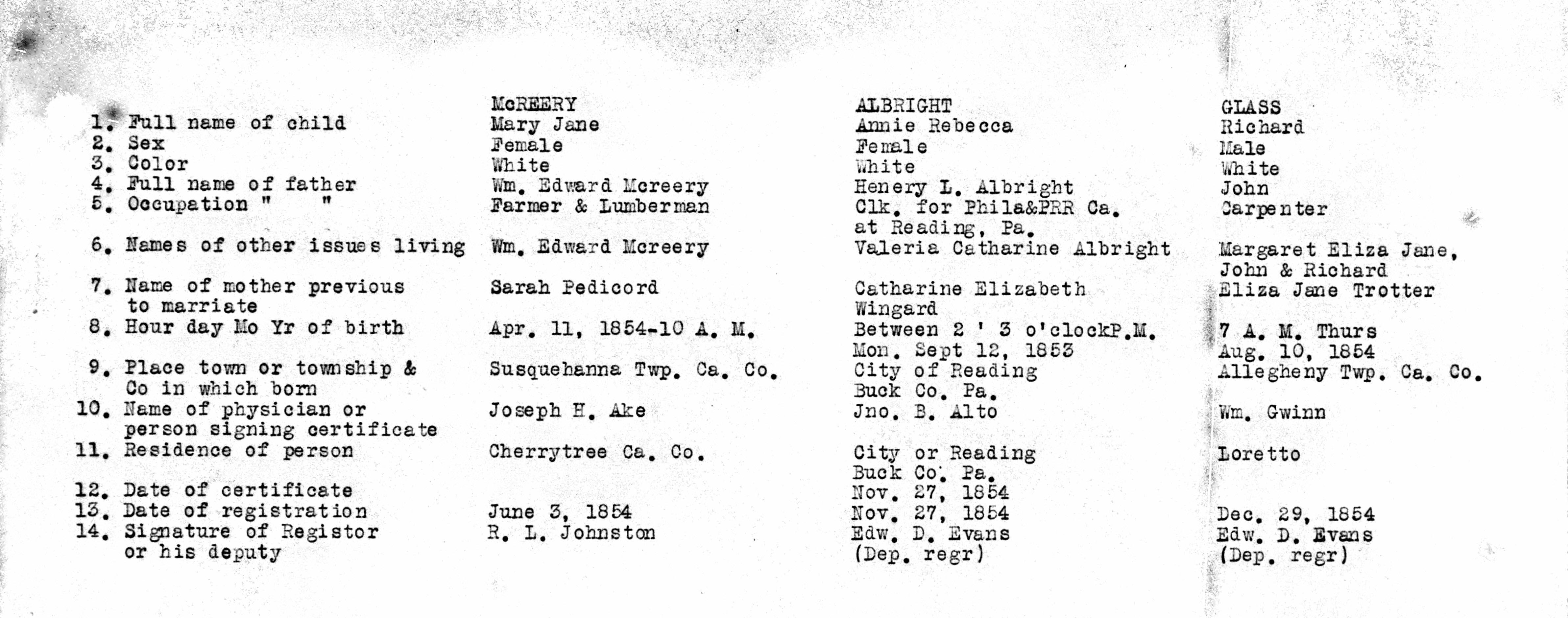 - Cambria Pennsylvania Births 1852-1854 06, McREERY, ALBRIGHT, PEDICORD, WINGARD