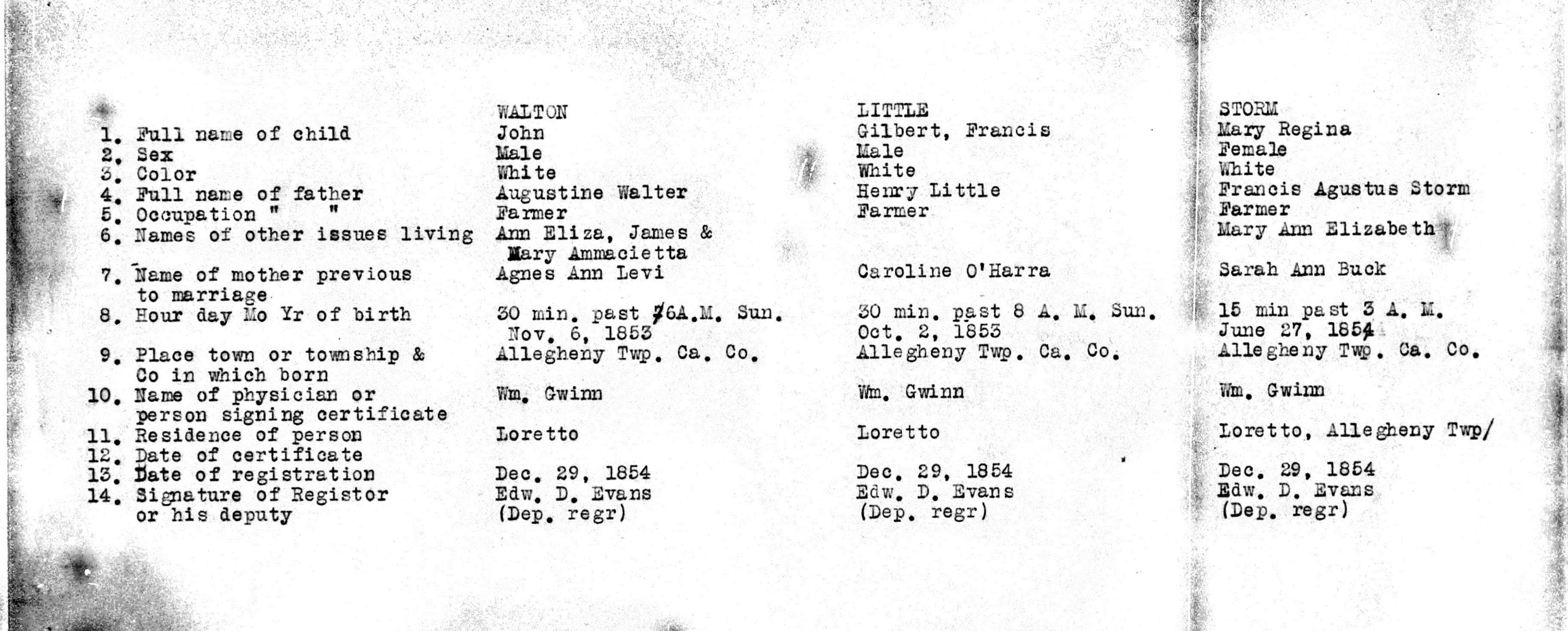 - Cambria Pennsylvania Births 1852-1854 07, WALTON, LEVI