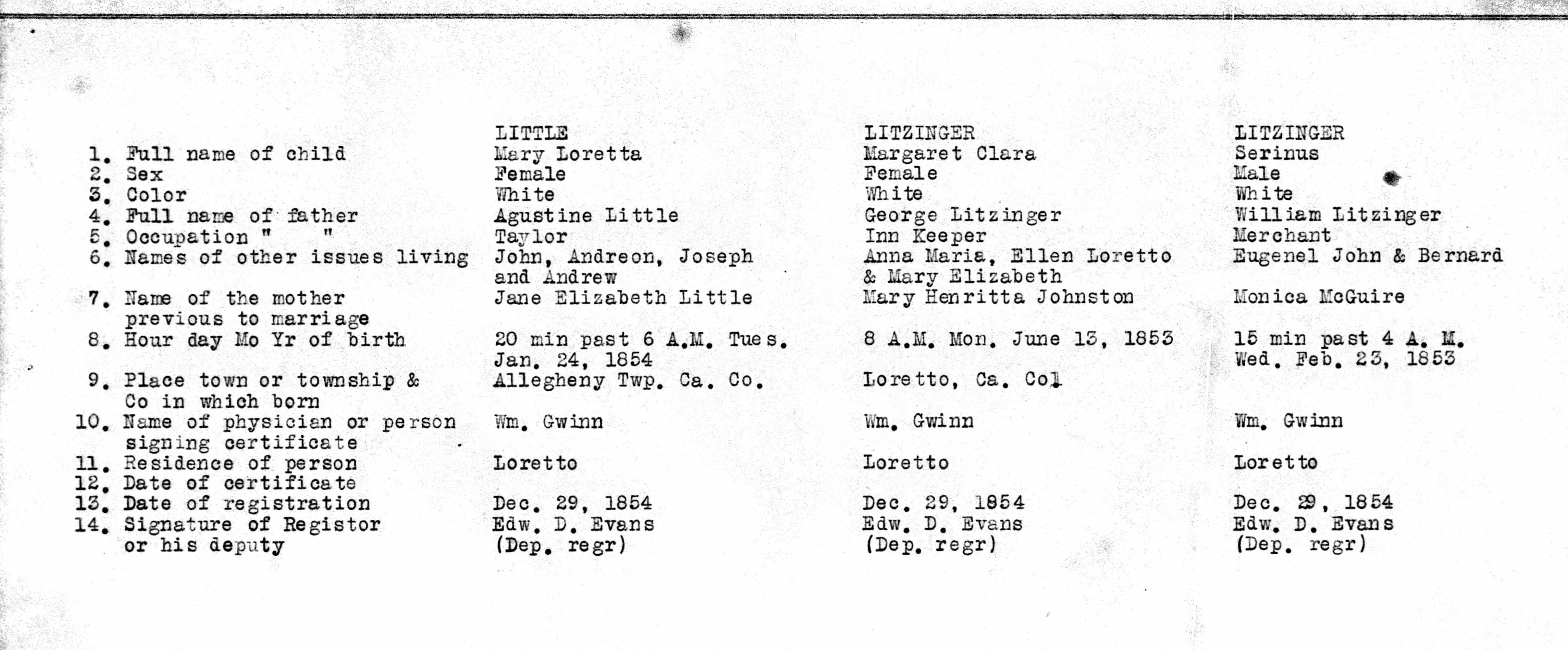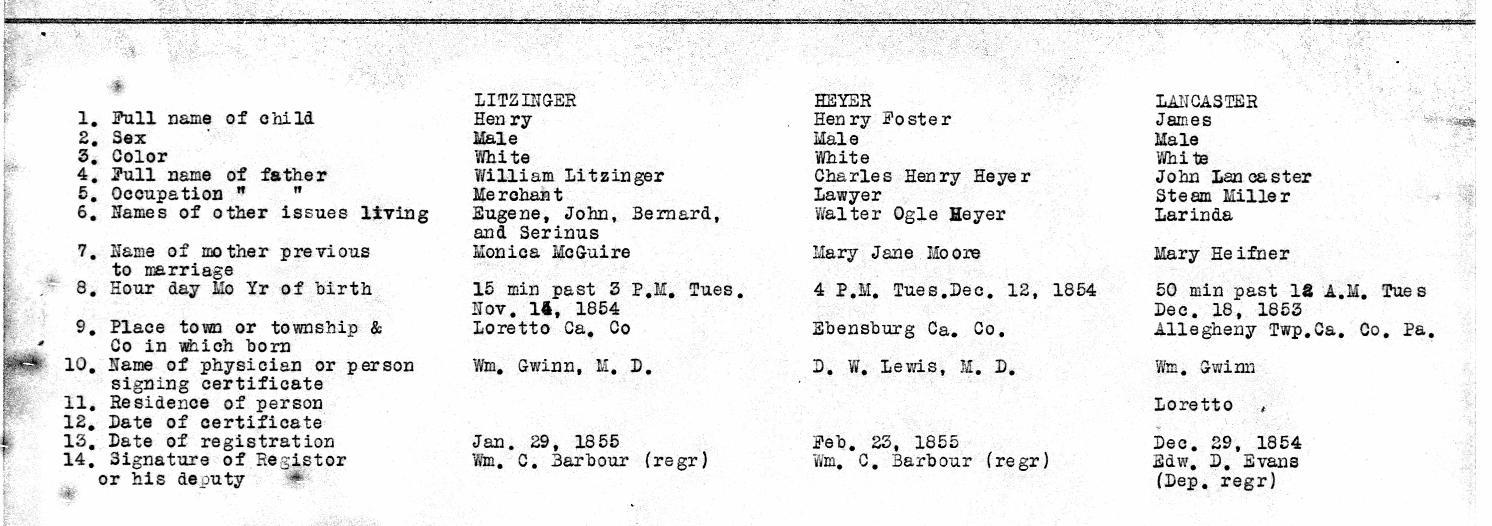- Cambria Pennsylvania Births 1852-1854 12, LITZINGER, HEYER, LANCASTER, McGUIRE, MOORE, HEIFNER