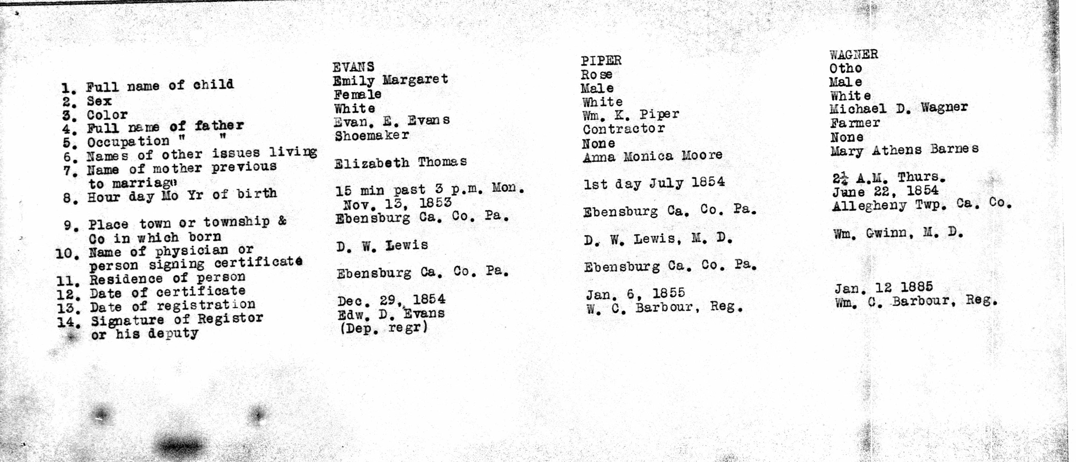 - Cambria Pennsylvania Births 1852-1854 10, EVANS, PIPER, WAGNER, THMAS, MOORE, BARNES