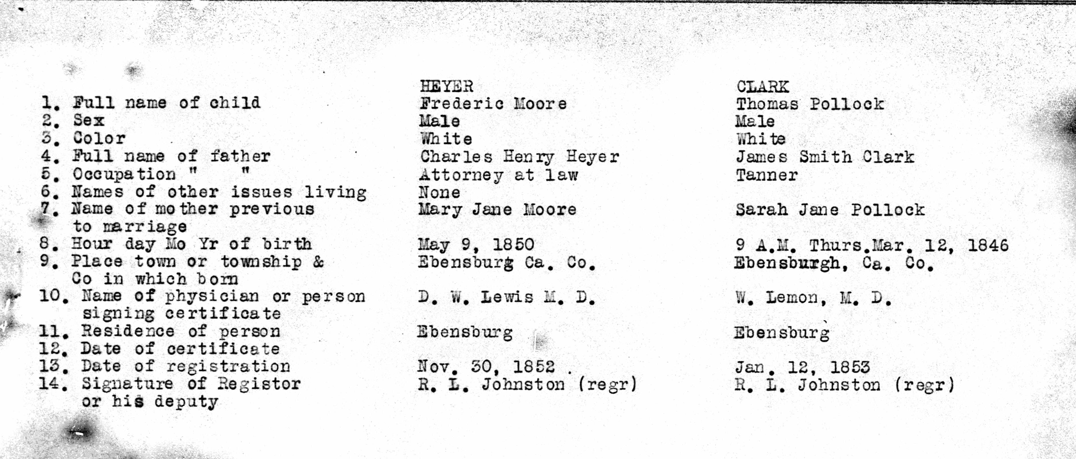 - Cambria Pennsylvania Births 1852-1854 13, MEYER, CLARK, MOORE, POLLOCK