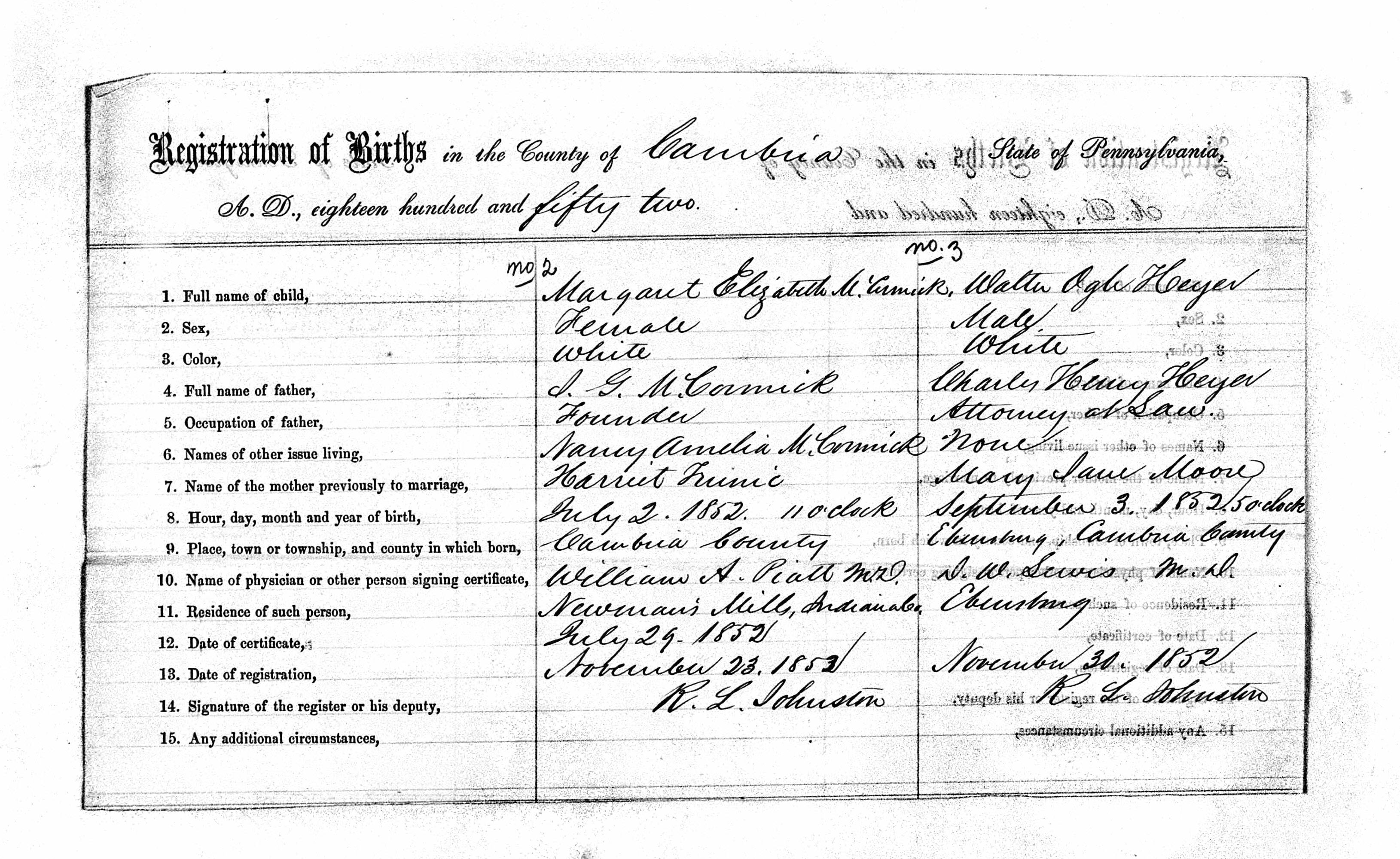 - Cambria Pennsylvania Births 1852-1854 15, McCORMICK, TRUNIC, HEYER, MOORE
