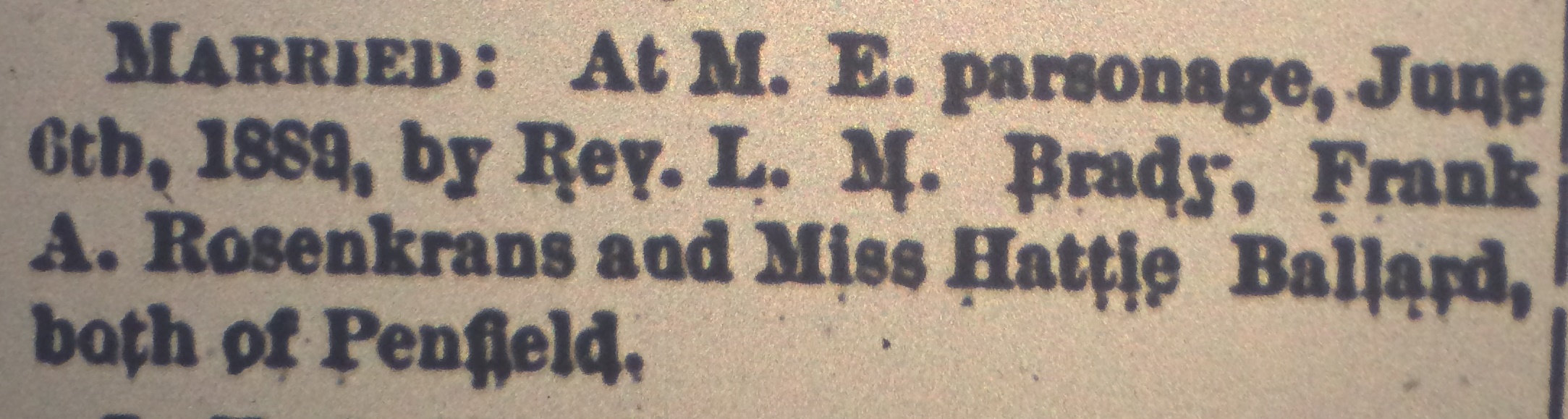 | Jun 15 1889 Frank Rosenkrans _ Hattie Ballard marriage Saturday Sentinel |