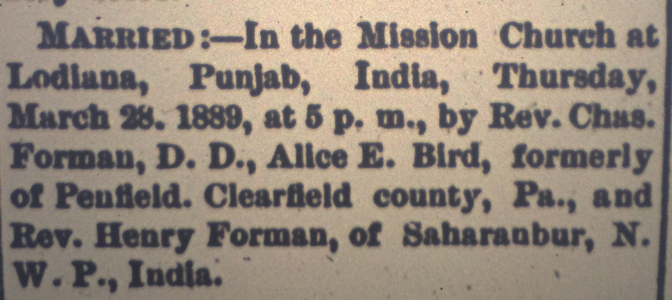 | May 11 1889 Alice Bird _ Rev. Henry Forman marriage Saturday Sentinel |
